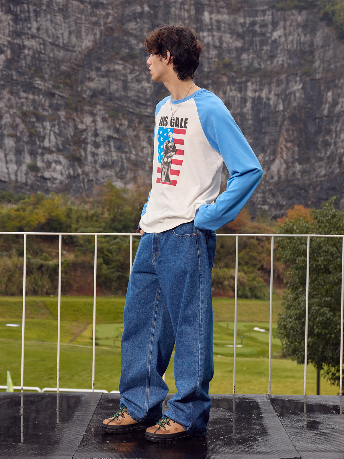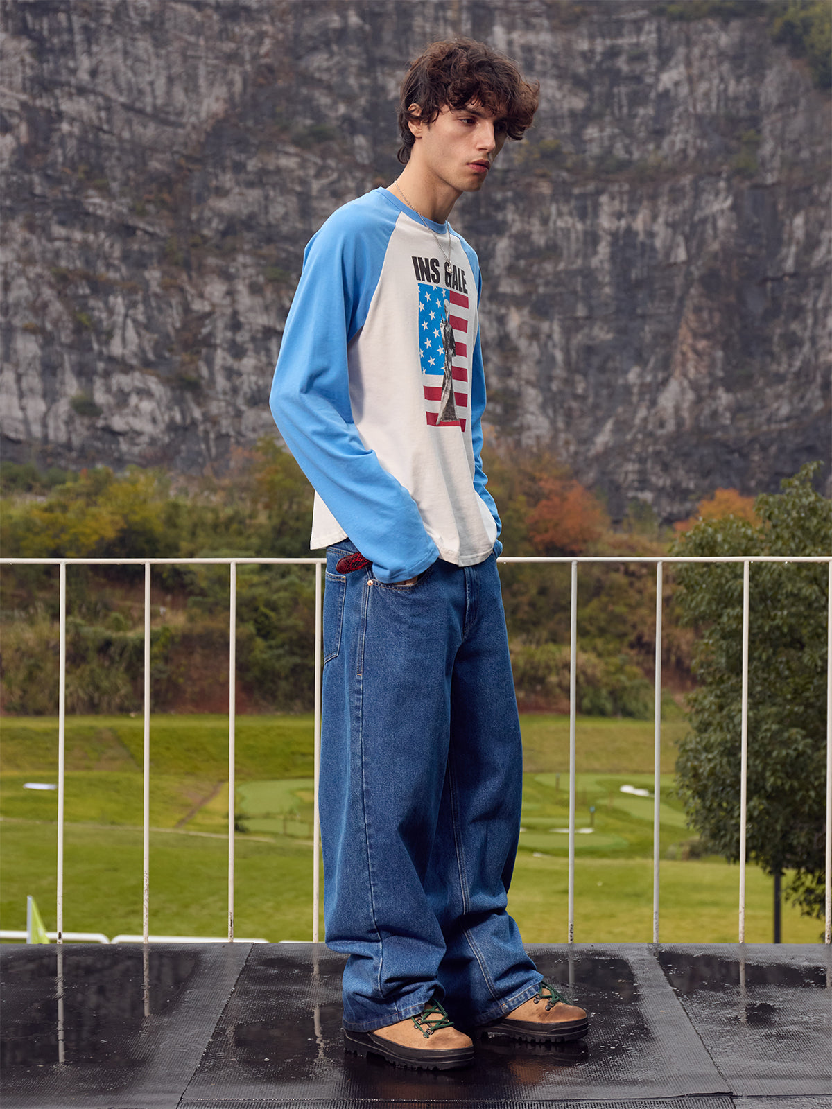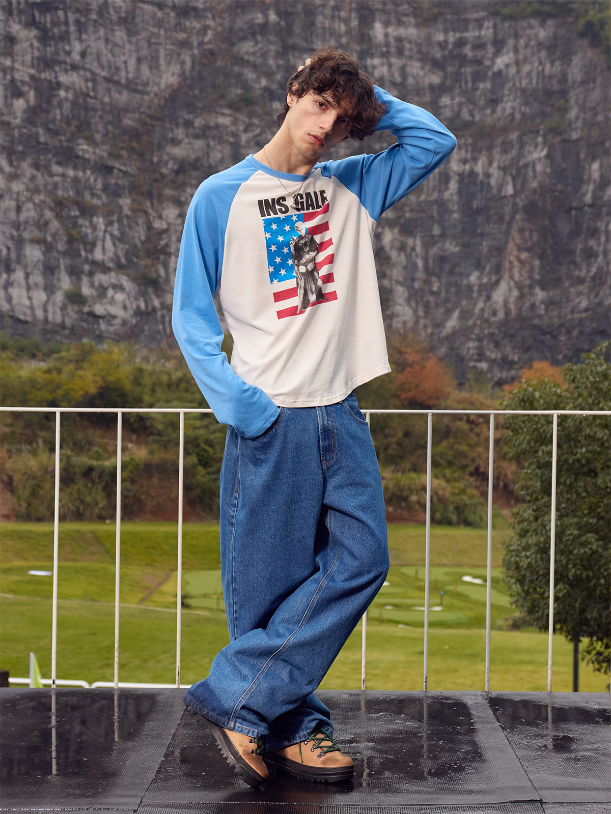 InsGale 25AW 藍白美國國旗人物插肩長T